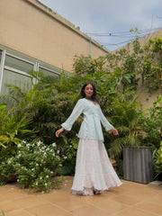 Immerse yourself in an aura of royal elegance with the Noor Jahan Set. This exquisite set includes a short modal designer kurti adorned with tasteful tassels, and a layered crushed cotton chikankari sharara. The sharara, accentuated with silver gota piping at the bottom, encapsulates a timeless traditional aesthetic. Lined with cotton, it ensures both comfort and style. Revel in the luxurious feel of this ensemble, curated to make you stand out in any setting.