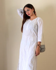 Indulge in the charm of hand-embroidered artistry with our Suhana Cotton Straight Kurta. This exquisite piece features delicate Chikankari embroidery adorning the front, back, and sleeves, creating a visual symphony. Crafted from soft and breathable cotton, this kurta offers a luxurious feel against your skin. With its Lakhnavi Chikan Kurti design, it's not just a garment; it's a heritage reimagined.